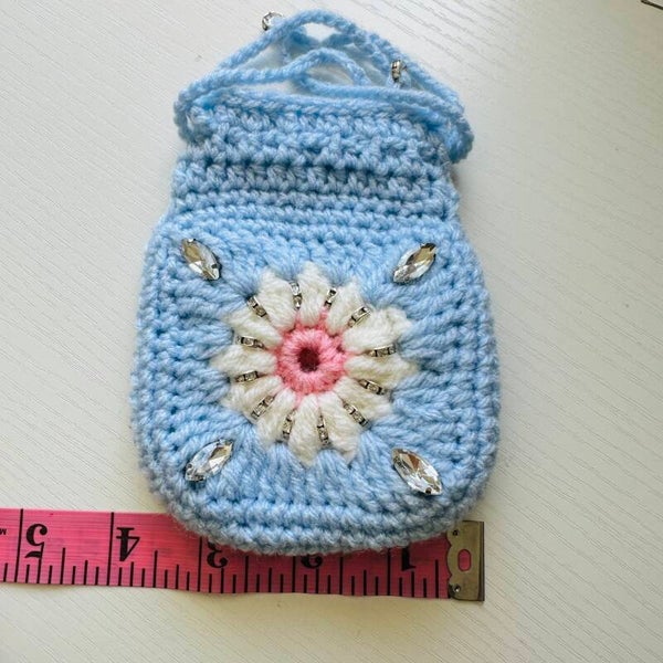 Handmade Baby Blue Crochet Drawstring Pouch – Rhinestone Coin & Gift Bag