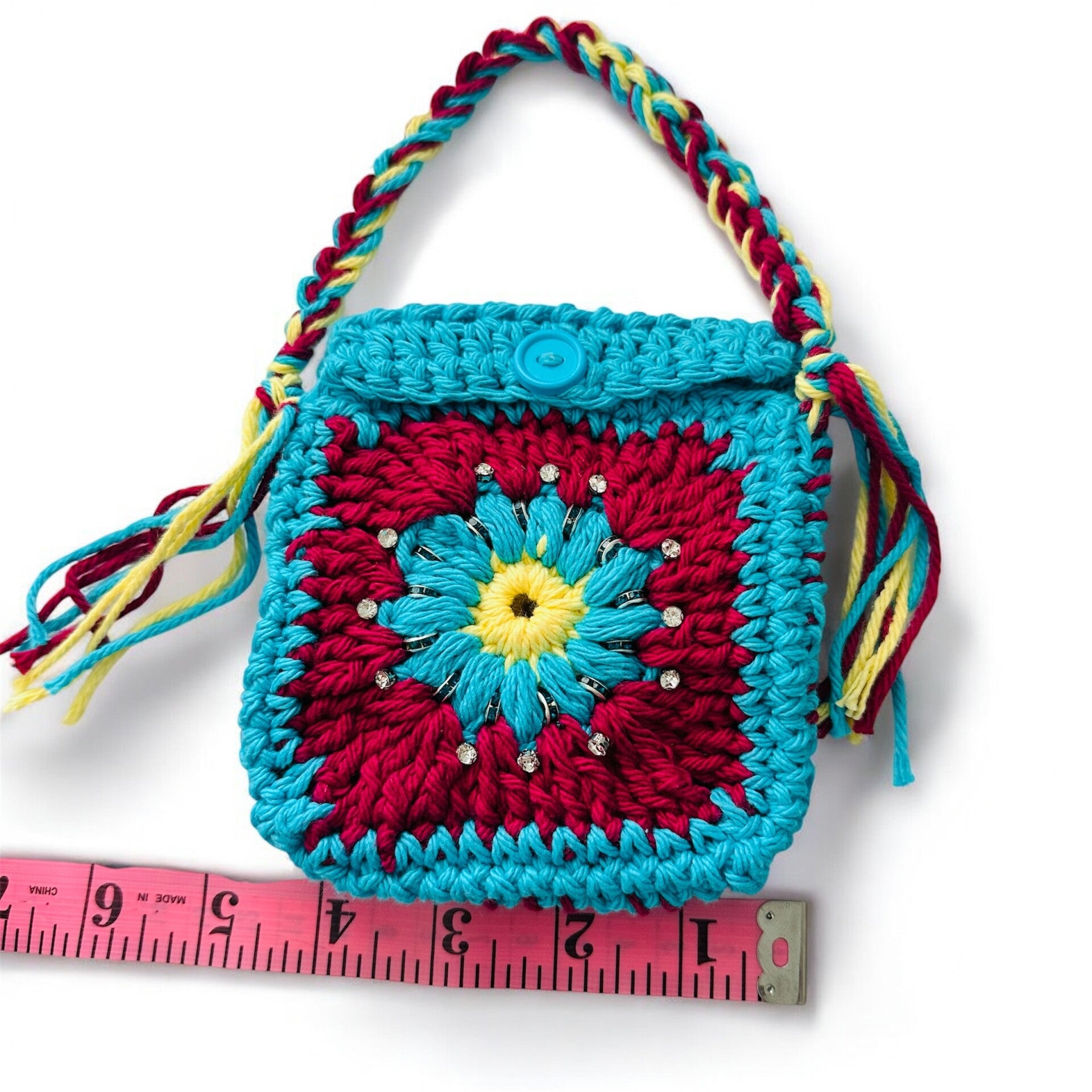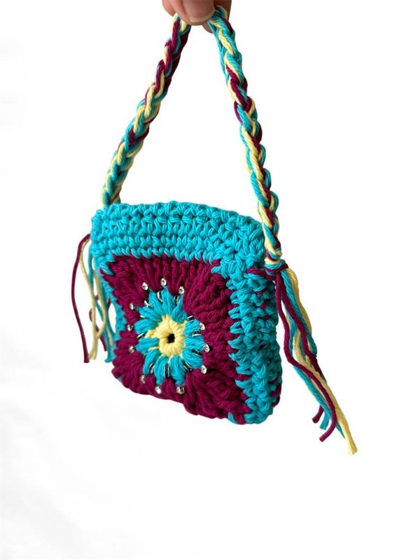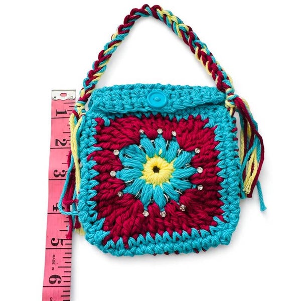 - Vibrant granny square floral motif in turquoise, burgundy, yellow & cream