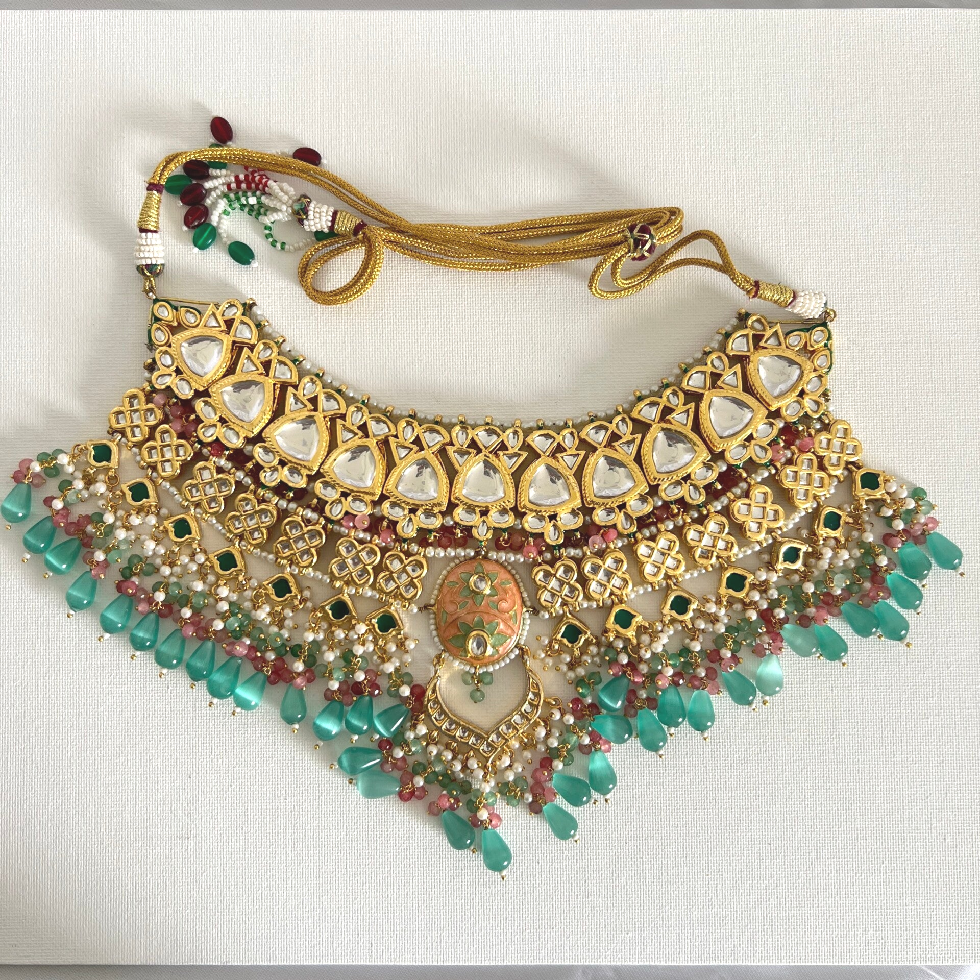 Bridal Kundan Polki Meenakari Choker Necklace Set with Green Beads